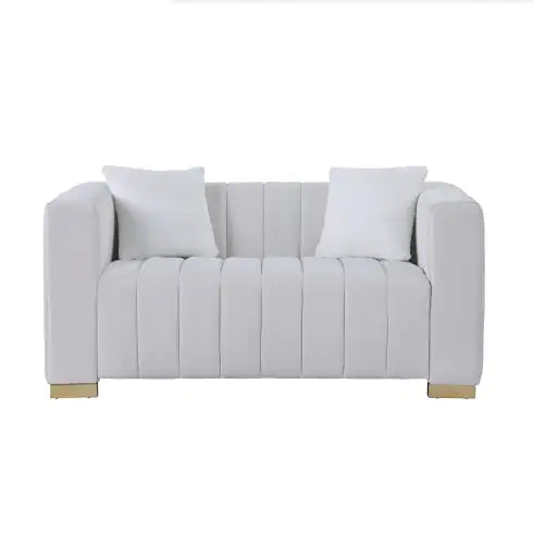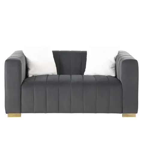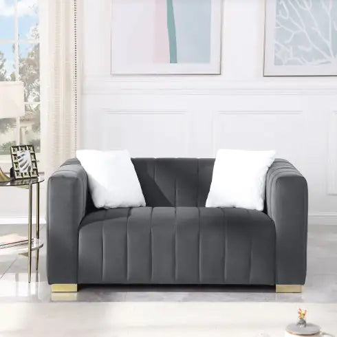 A modern channel sofa take on a traditional Chesterfield, the sofa is a statement - making piece of beautiful design. Rich velvet is chanelled on both the inside and outside of the frame, a beautiful design detail that can be seen from any angle in a room. Single "bench" cushions allow for comfortable multi person seating without cushion separations.